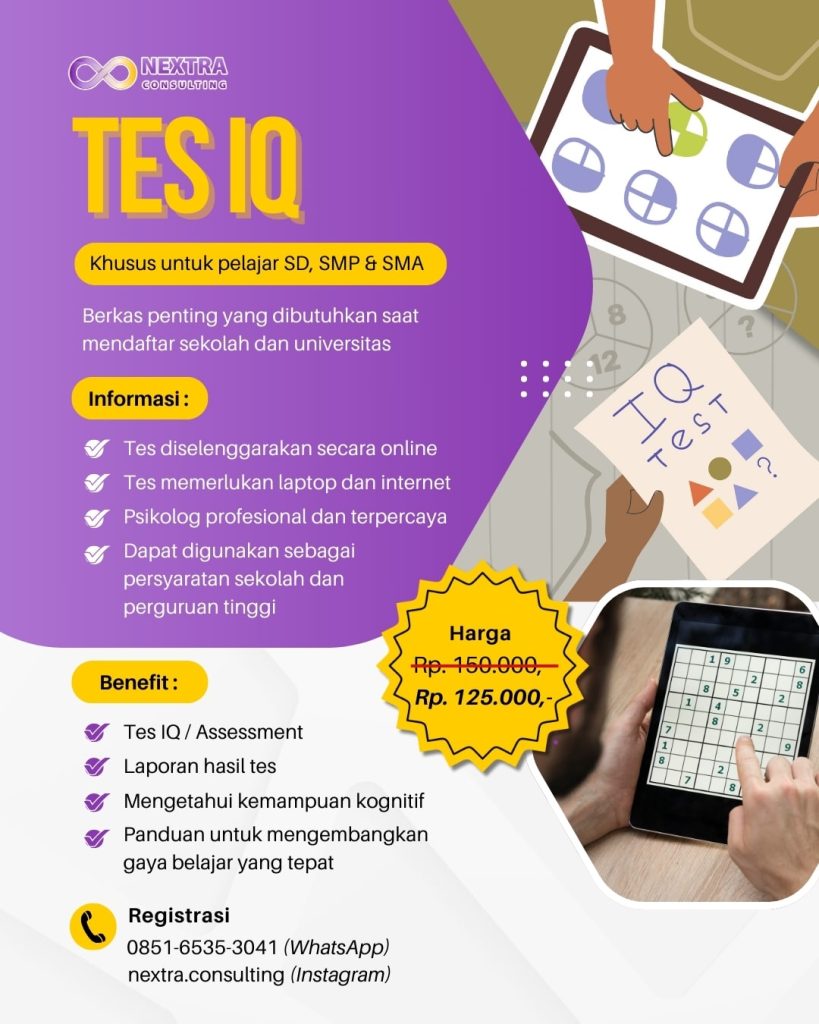• Tes IQ / Assessment : Penilaian mendalam yang akurat tentang kecerdasan Anda.