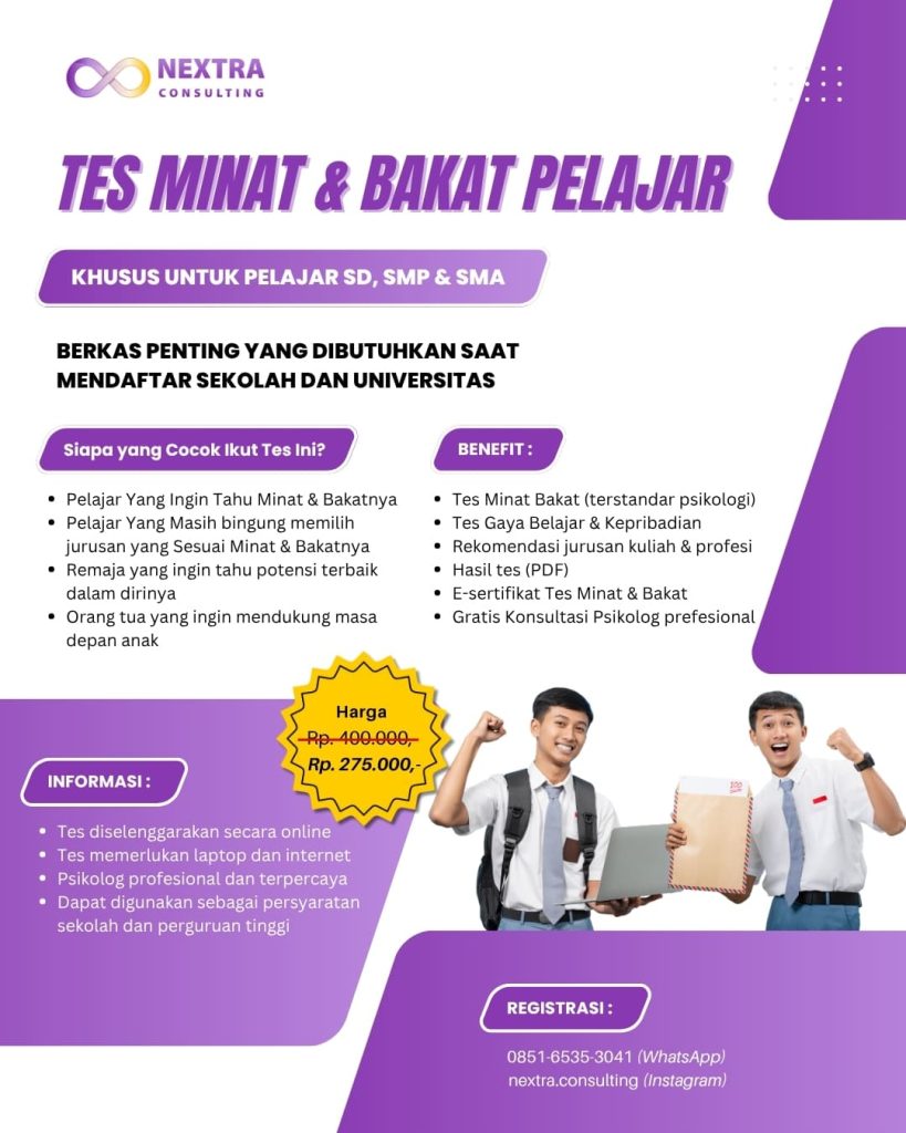 Tes Minat & Bakat Nextra Consultings IQ Nextra Consulting adalah asesmen psikologi profesional yang membantu pelajar memahami potensi, kepribadian, dan arah karier yang sesuai dengan dirinya.